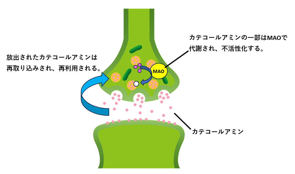 カテコールアミンの中でもアミノ基を1つだけ含むものをモノアミンといい、MAOはこれを代謝し不活性化します。