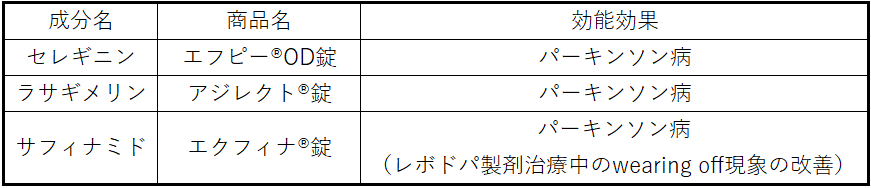 上記はいずれもMAOB阻害薬です。MAOBを阻害することでドパミンの分解を抑制し、パーキンソン病に効果を発揮するわけですね。
