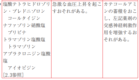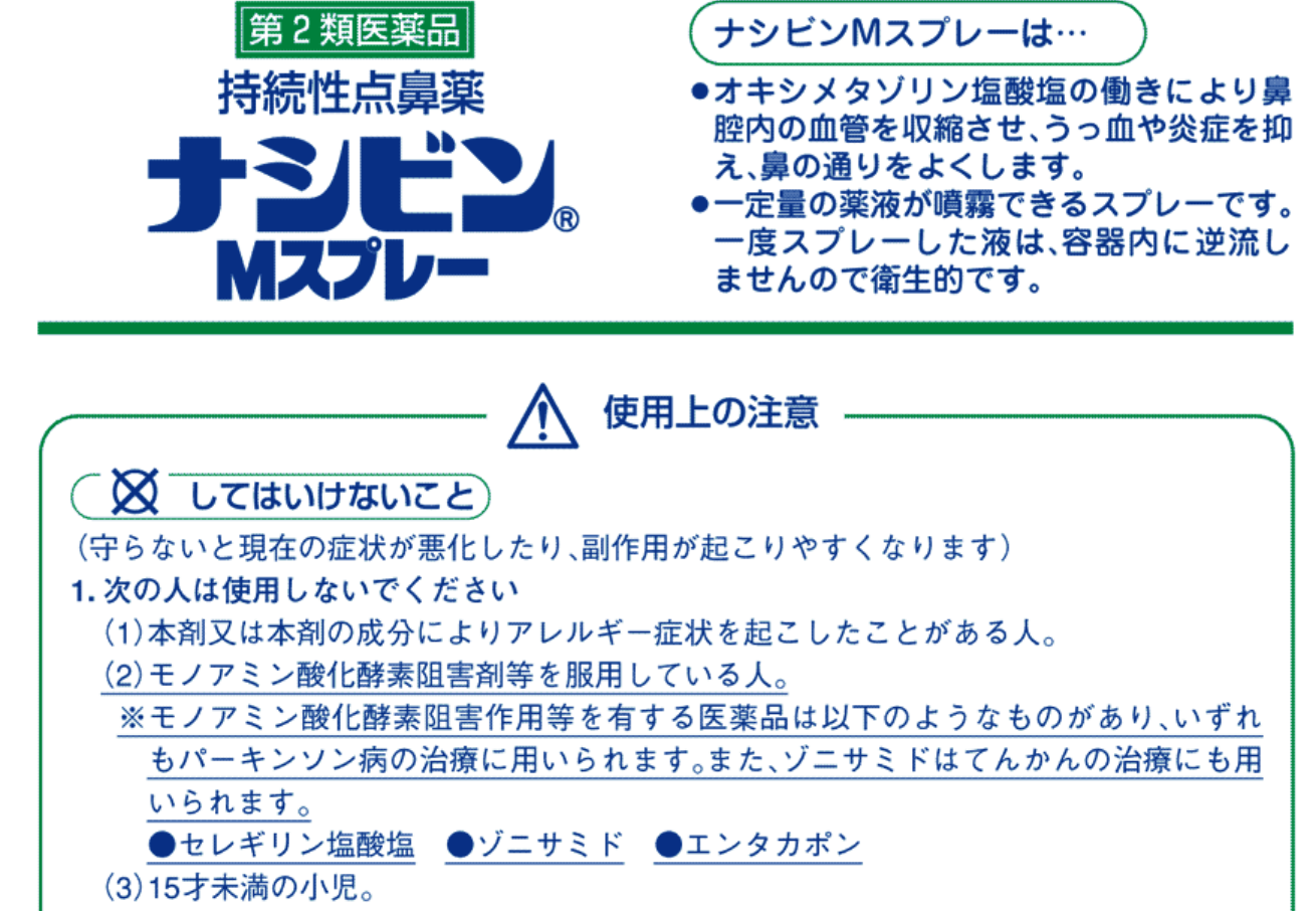 ナシビンMスプレーの有効成分はオキシメタゾリンであり、これもα受容体刺激作用をもつ血管収縮剤です。MAO阻害薬との併用で効果が増強し、血圧上昇などの副作用が起きる可能性があります。医療用医薬品の添付文書にはオキシメタゾリンの記載はありませんが、よく考えれば併用禁忌ということは理解できると思います。