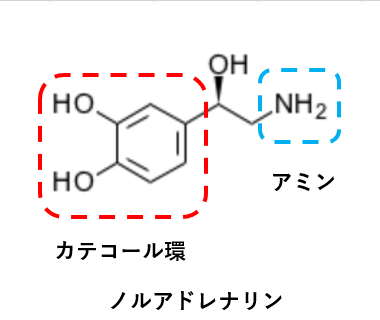 カテコールアミンとはカテコール環とアミンをもつ神経伝達物質の総称で、アドレナリン、ノルアドレナリン、ドパミンなどがあります。