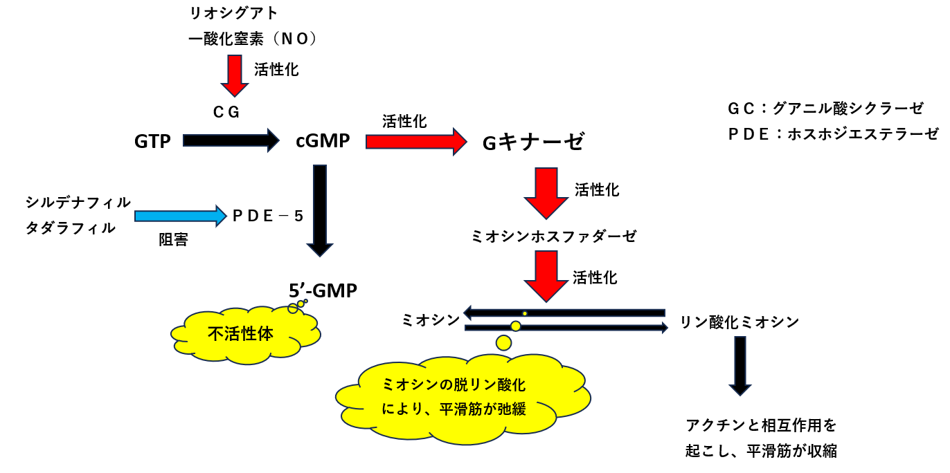 ホスホジエステラーゼ‐5(以下PDE-5)を阻害することでcGMPの分解が阻害されます。cGMPの増加⇒Gキナーゼの活性化⇒ミオミオシホスファターゼの活性化⇒平滑筋の弛緩といったプロセスにより血圧が低下するわけですね。