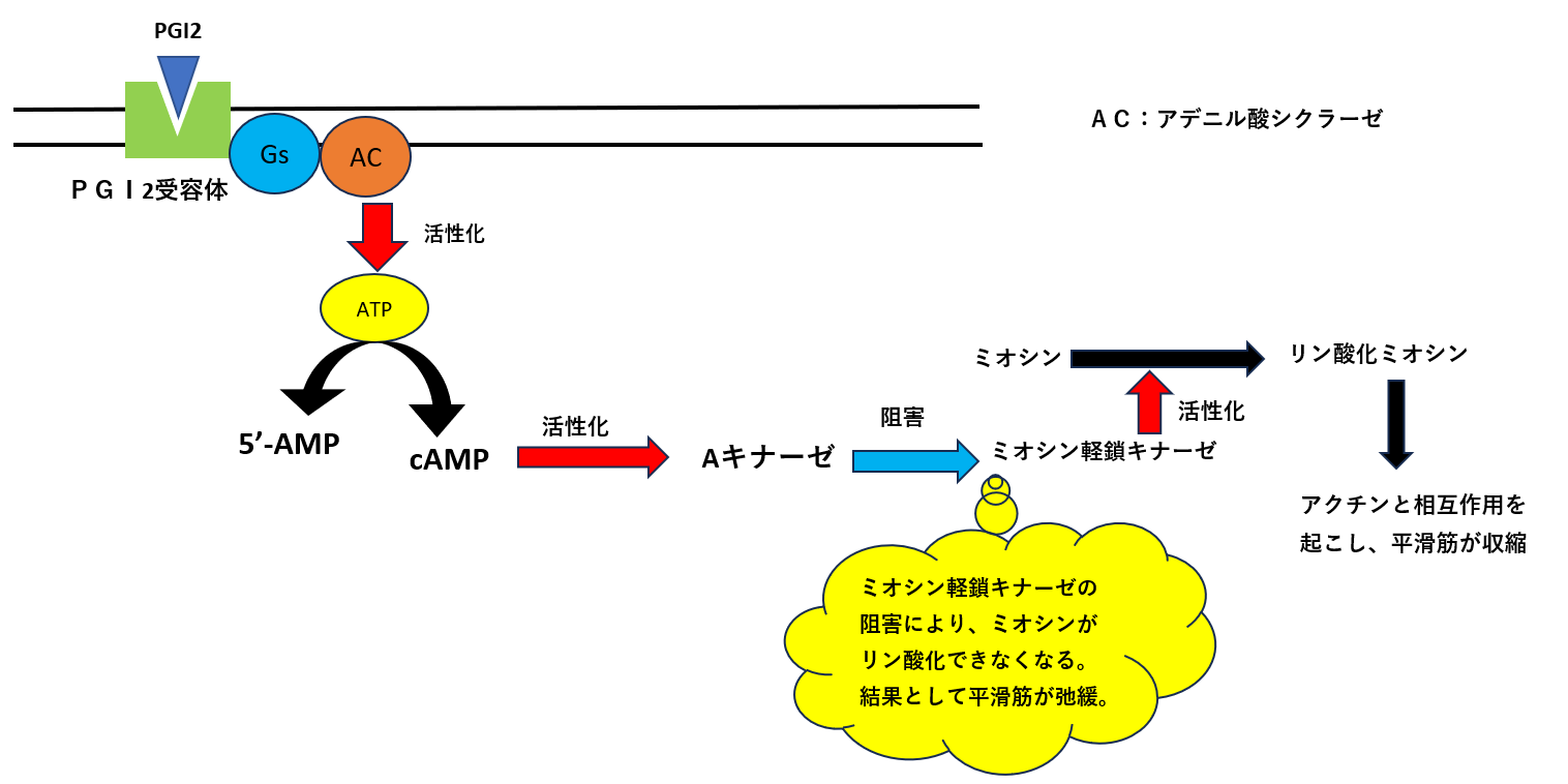 プラスタグランジン(以下PG)I2受容体はGs共役型受容体です。PGI2受容体の刺激によりアデニル酸シクラーゼ(以下AC)の活性化が起こり、ATPからcAMPの産生の促進⇒Aキナーゼの活性化⇒ミオシン軽鎖キナーゼの不活性化といったプロセスにより血管平滑筋が弛緩します。