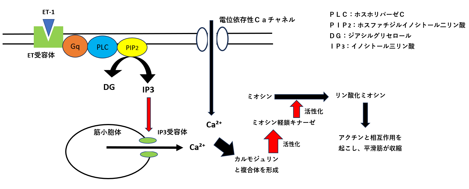 肺動脈にはエンドセリン受容体(以下ET受容体)が発現しています。ET受容体にはETA受容体、ETB受容体がありますが、いずれもGタンパク共役型受容体です。Gi、Gqと共役していますが、おもにGqと共役しています。つまりETA受容体、ETB受容体の刺激により血管平滑筋が収縮します。エンドセリンには1~3がありますが、なかでもエンドセリン‐1が強力な血管収縮物質として知られています。