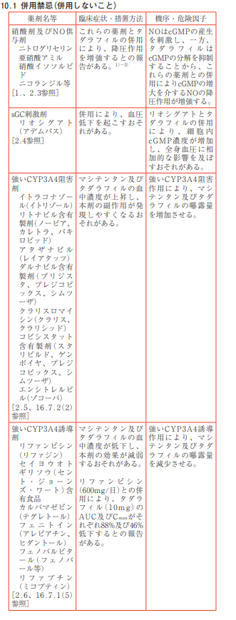 マシテンタンは主にCYP3A4及びCYP2C9により代謝され、タダラフィルは主にCYP3A4により代謝されます。そのためCYPを強く阻害、誘導する薬との併用が禁忌になります。またPDE-5阻害薬のタダラフィルを含有しているので、NO誘導体とは併用禁忌になります。またGC刺激薬との併用も併用禁忌です。CGを刺激する薬物と併用するとPDE-5阻害薬とダブルでcGMPを増加させてしまうからですね。
