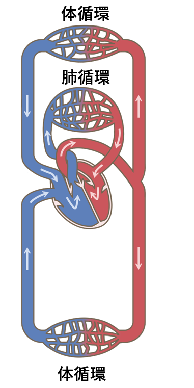 全身を循環し二酸化炭素を多く含んだ血液(静脈血)は上大静脈・下大静脈から右心房へ運ばれます。右心房から右心室に送られた静脈血は肺動脈を介して肺に送られ、肺で酸化炭素と酸素のガス交換が行われます。血液は酸素を多く含んだ血液(動脈血)となり、肺静脈から左心房に送られます。左心房から左心室に送られた動脈血は大動脈を介して全身に送られ、これを繰り返します。