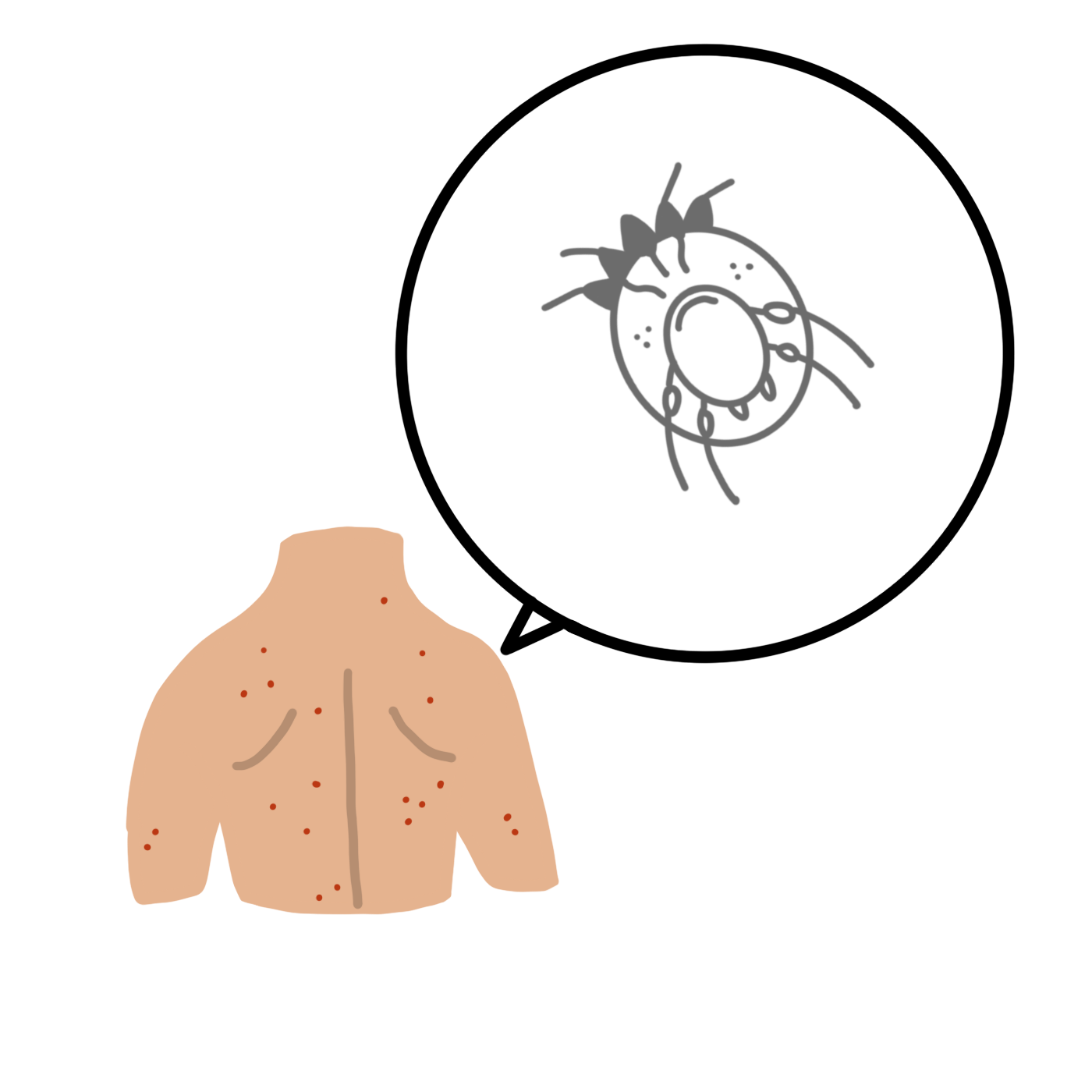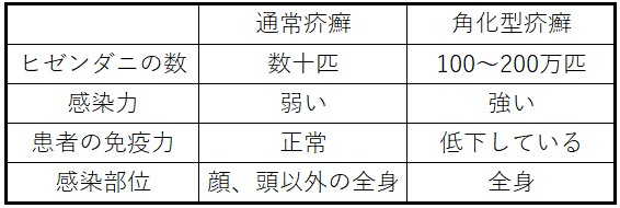 疥癬とはヒゼンダニ(疥癬虫)というダニによる皮膚感染症です。角質層でヒゼンダニが増殖することで激しい痒みを生じます。疥癬には感染力の弱い通常疥癬と、感染力の強い角化型疥癬があります。