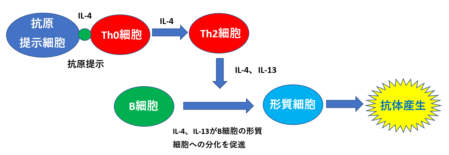 IL-4、IL-13はヘルパーT細胞によるB細胞の活性化を阻害します。B細胞は形質細胞に分化するので、IL-4、IL-13の作用を阻害することで抗体産生が抑制されることになります。これによりアレルギーの原因となるIgE抗体の産生が抑制されます。
