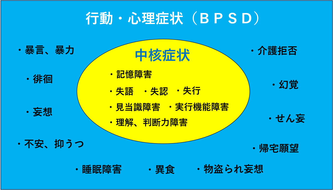 徘徊、妄想、不安・抑うつ、物盗られ妄想、幻覚、せん妄、暴言・暴力、異食、睡眠障害、帰宅願望、介護拒否など数多くあります。
