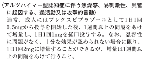 「アルツハイマー型認知症に伴う焦燥感、易刺激性、興奮に起因する、過活動又は攻撃的言動」