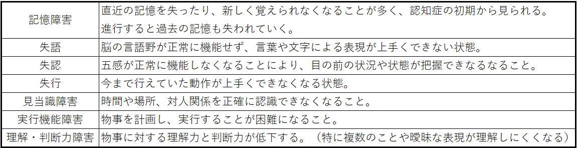 中核症状は脳の神経細胞の障害、減少などによって直接起こる症状です。認知症になると必ず起きる症状であり、代表的なものとして以下のようなものがあります。