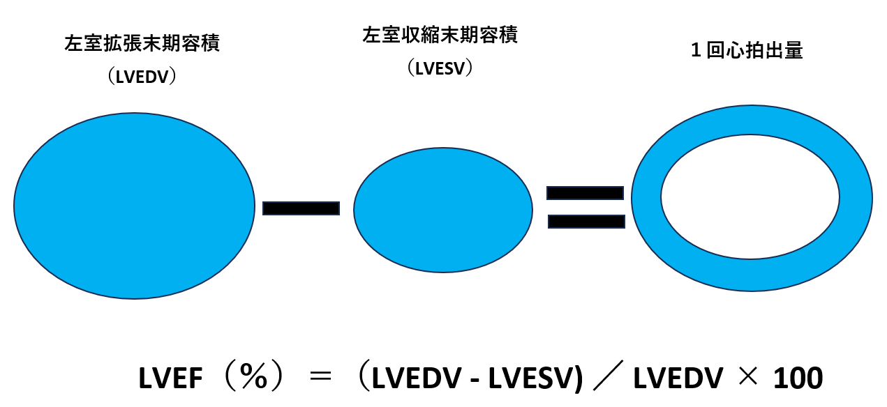 LVEF(左室駆出率)とは左心室の収縮力機能を示す値です。心臓が血液を送り出す際に、左心室がどの程度、血液を送り出しているかを表します。
