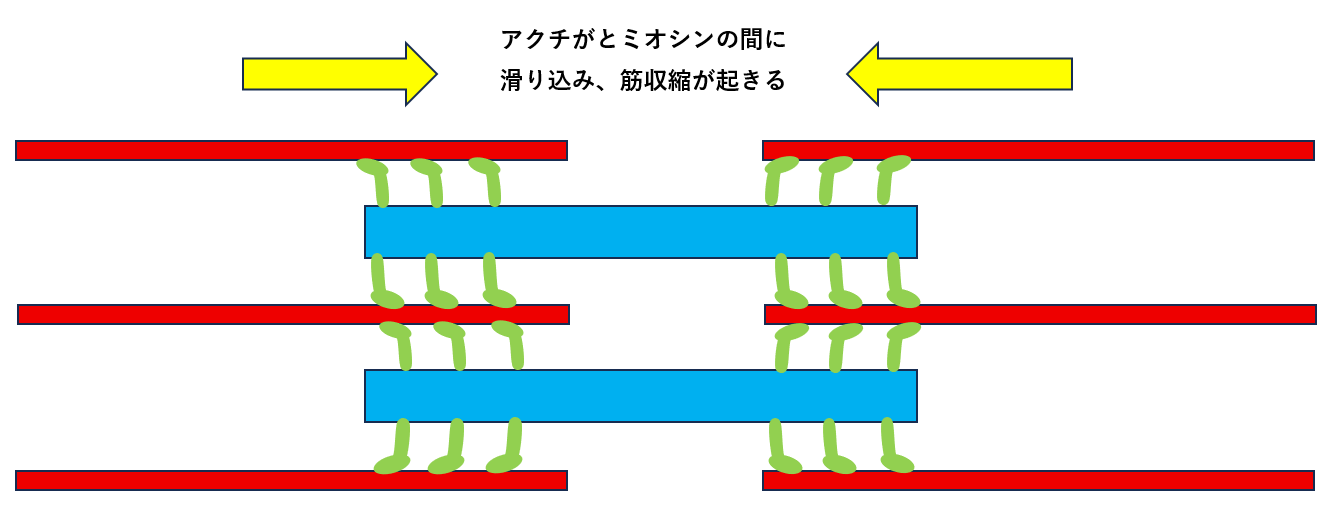 ミオシン頭部はATPを加水分解することでエネルギーを産生します。するとミオシン頭部は振り子運動をしてアクチン引っ張り、ミオシンの間に滑り込ませることで筋肉が収縮します。