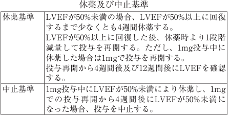 またLVEFが50%未満になった場合は休薬か中止を行わなければなりません。休薬・中止基準は以下のようになっています。