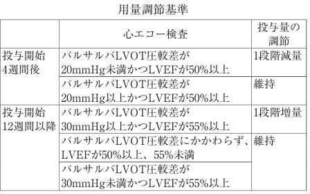 このようにLVEFとバルサルバLOVT圧較差を用いてHOCMの状態を確認し、その程度によって用量の調節を行います。用量の調節には用量調節基準が定められており、以下のように行います。