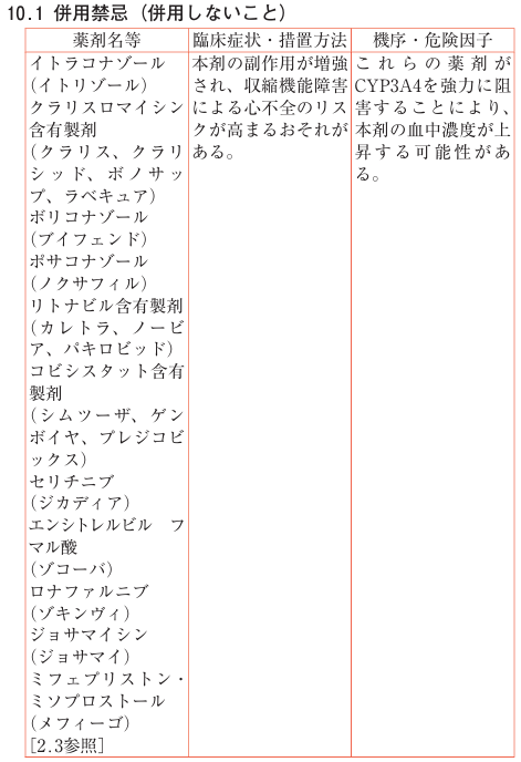 「本剤投与中に強い若しくは中程度のCYP2C19阻害剤、又は中程度若しくは弱いCYP3A4阻害剤の投与を開始又は増量する場合は用量を1段階減量(1mgを投与中の場合は休薬)し、4週間後にLVEFを確認すること。」