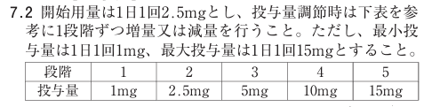 減量増量は1段階と記載されていますが、1~5段階の用量は以下のようになっています。