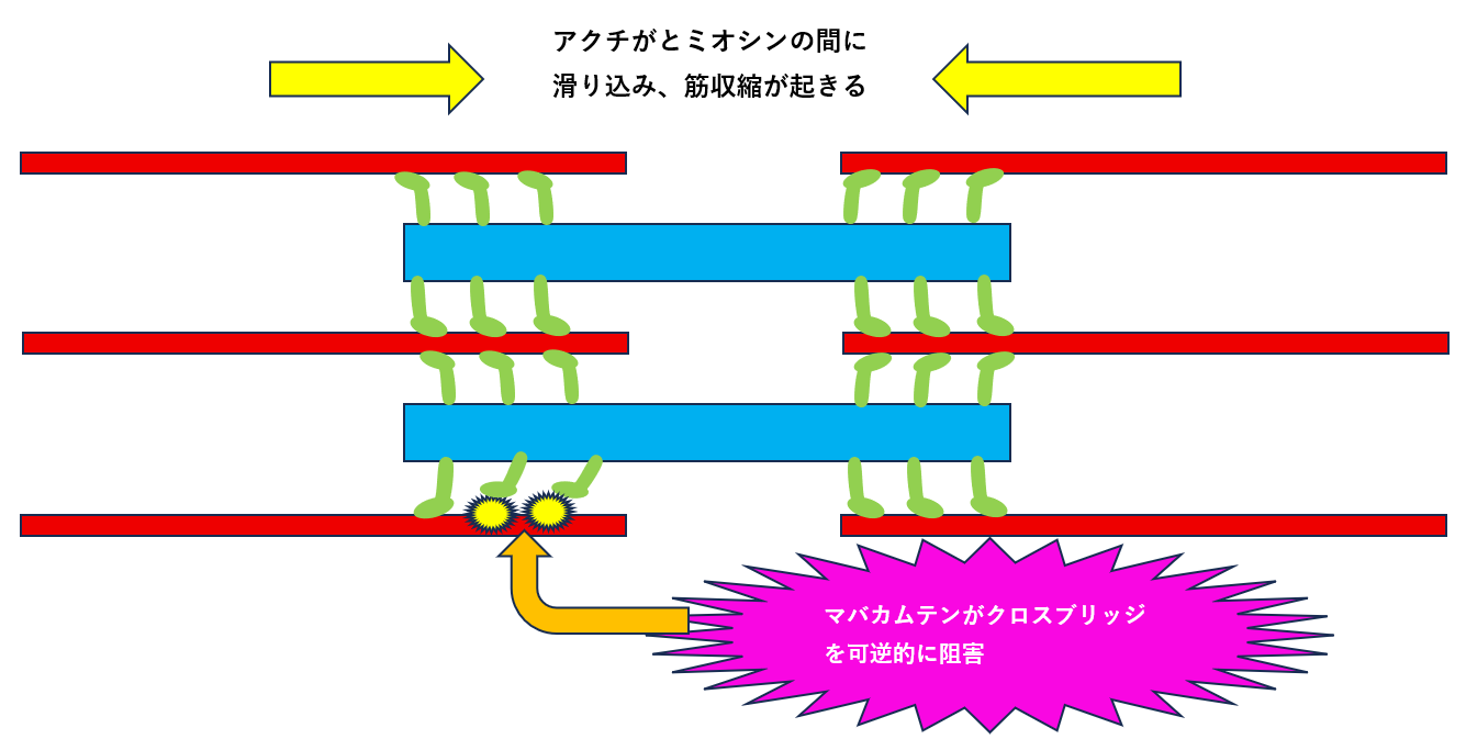マバカムテンはミオシン頭部に結合することによって、クロスブリッジを可逆的に阻害します。