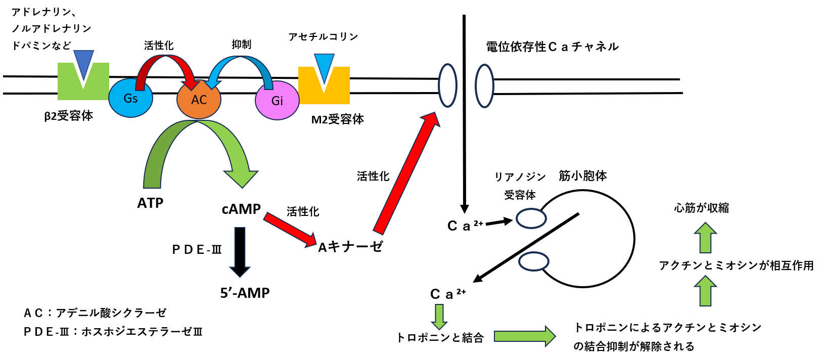 アドレナリン、ノルアドレナリン、ドパミンなどのβ2受容体のリガンドが結合すると、アデニル酸シクラーゼが活性化し、ATPがcAMPに分解されます。cAMPが増加するとAキナーゼが活性化し、Aキナーゼは電位依存性Caチャネルを活性化し、Ca²⁺が細胞外から流入します。Ca²⁺は筋小胞体のリアノジン受容体に結合すると筋小胞体内のCa²⁺が放出され、放出されたCa²⁺はアクチンとミオシンの結合を抑制してているトロポニンというタンパク質に結合します。するとトロポニンとトロポミオシンによる結合抑制が解除され、アクチンとミオシンが結合することで心筋が収縮します。