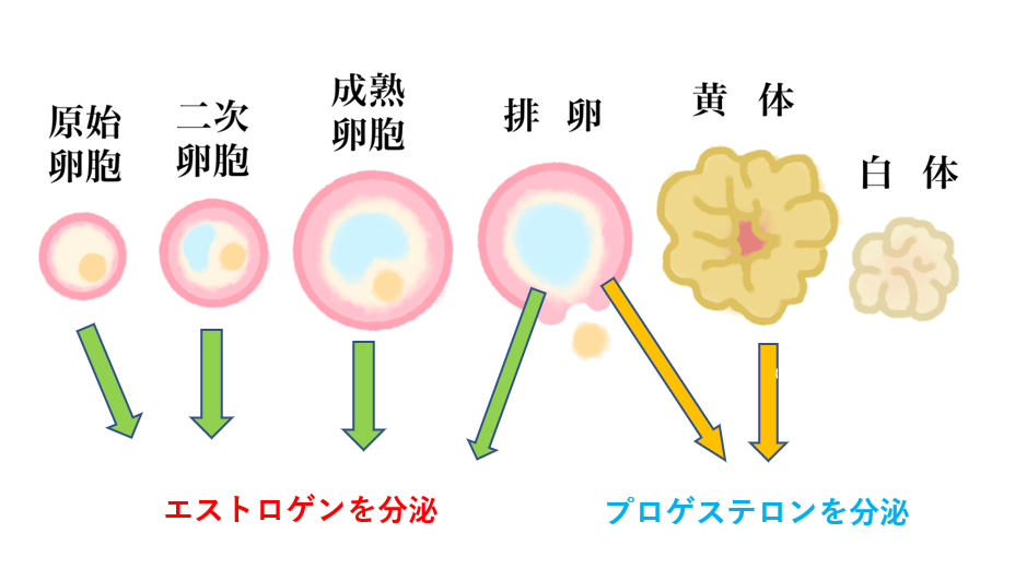 この卵胞からエストロゲン(卵胞ホルモン)が分泌され、黄体になるプロゲステロン(黄体ホルモン)が分泌されるわけです。