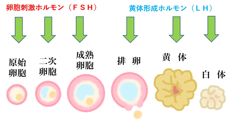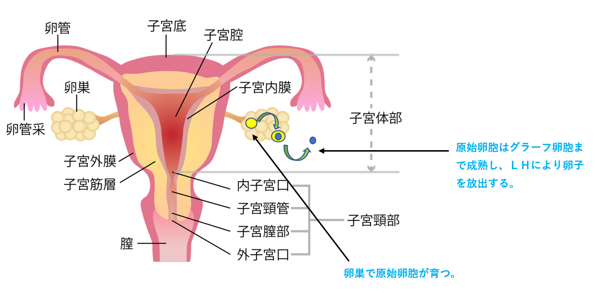 卵胞は卵巣で作られますが、卵胞の最初の段階を原始卵胞と言います。この原始卵胞が卵胞刺激ホルモン(FSH)によってグラーフ卵胞(成熟卵胞)になり、グラーフ卵胞は黄体形成ホルモン(LH)によって卵子を放出します。これが排卵です。