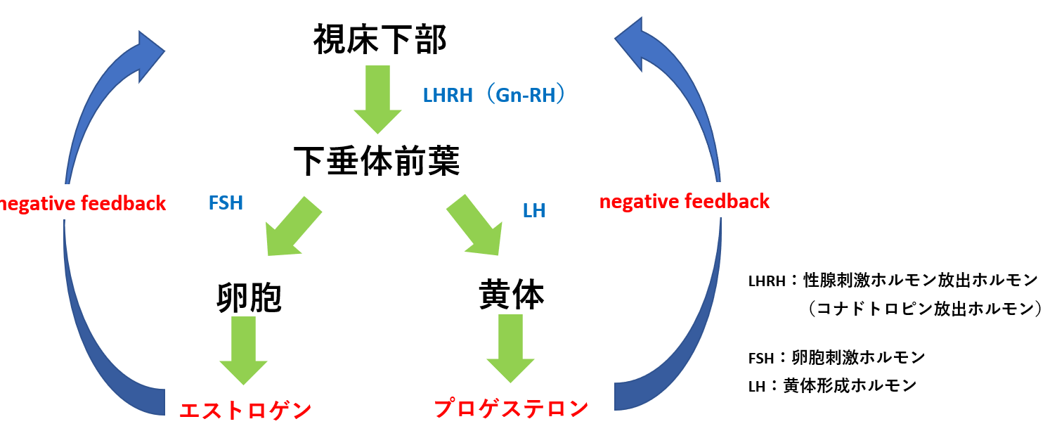 過去に何度も紹介していますが、まず初めに性ホルモンの分泌調節機構についておさらいしましょう。視床下部から性腺刺激ホルモン放出ホルモン(LHRH)が分泌され、これにより下垂体前葉から卵胞刺激ホルモン(FSH)、黄体形成ホルモン(LH)が分泌されます。