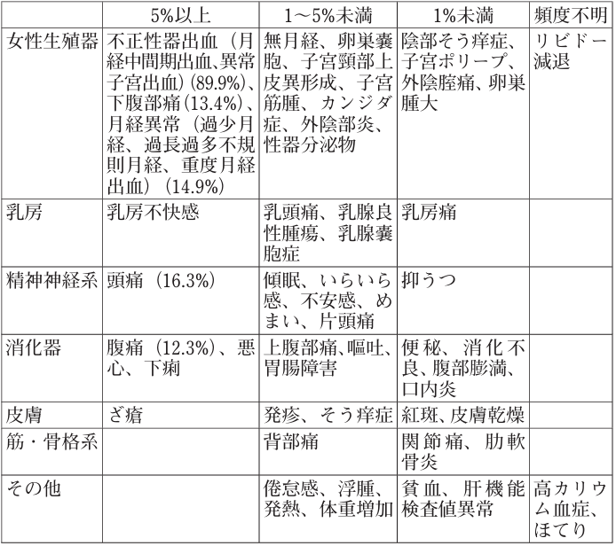 不正性器出血は89.9%と非常に高いですが、作用機序からすれば当然でしょう。不正性器出血とは通常の月経周期以外の時期に性器出血があることです。外部から性ホルモンを摂取するため、ホルモンバランスが崩れ、子宮内膜が剥がれ落ち、出血につながります。