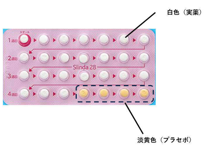スリンダ®錠28は実薬の白色錠の他にプラセボの淡黄色錠でなっており、毎日服用します。