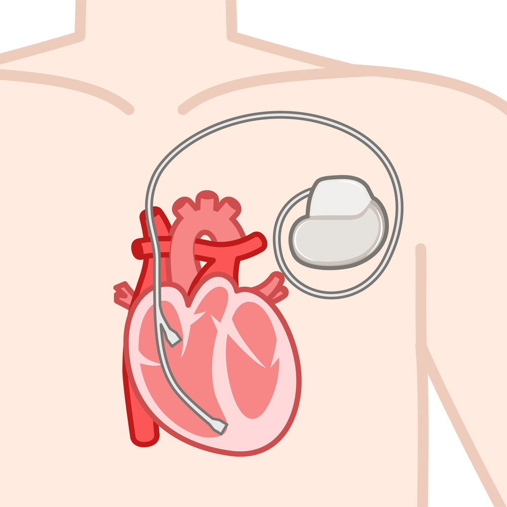 局所麻酔を行い、ペースメーカー本体を胸の皮下に埋め込みます。その後リードと呼ばれる細い電線を鎖骨下静脈を通して心臓に挿入します。最後にリードをペースメーカー本体と接続します。