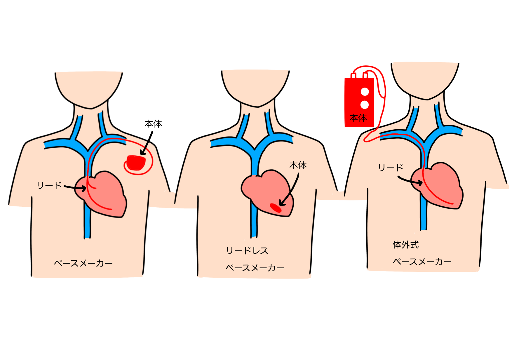 なおペースメーカーには恒久的ペースメーカーと一時的ペースメーカーがあります。最終的には恒久的ペースメーカーを使うことになりますが、恒久的なペースメーカーの手術までの期間や一時的な不整脈の治療には一時的ペースメーカーが用いられます。
