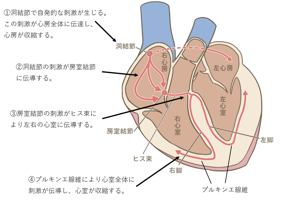 心筋が収縮するは洞結節で興奮が生じ、それが心房や心室に伝わる必要があります。