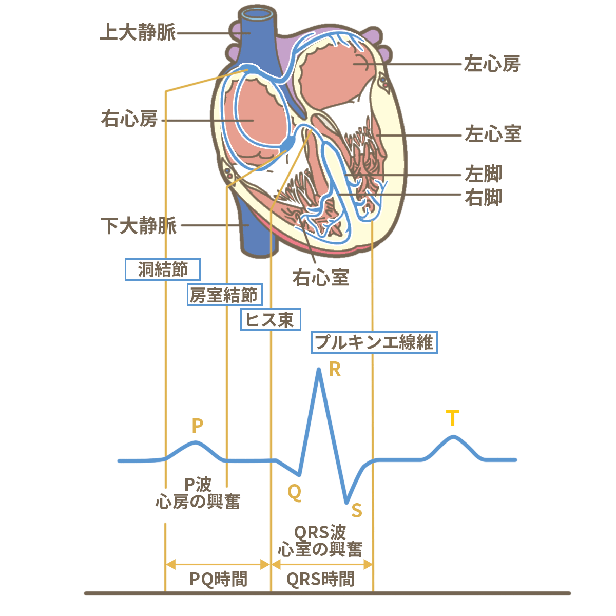 P波は心房の興奮を表し、PQ時間(またはPR時間)は房室間の興奮の伝導時間を表します。QRSは心室全体に興奮が広がっている時間を表し、T波は心室の興奮が消退していく際に生じます。QT時間は心室の興奮の開始から興奮の消退までの時間を表します。