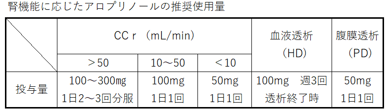 「高尿酸血症・痛風の治療ガイドライン第3版」では腎障害におけるアロプリノールの投与量は以下のようになっています。
