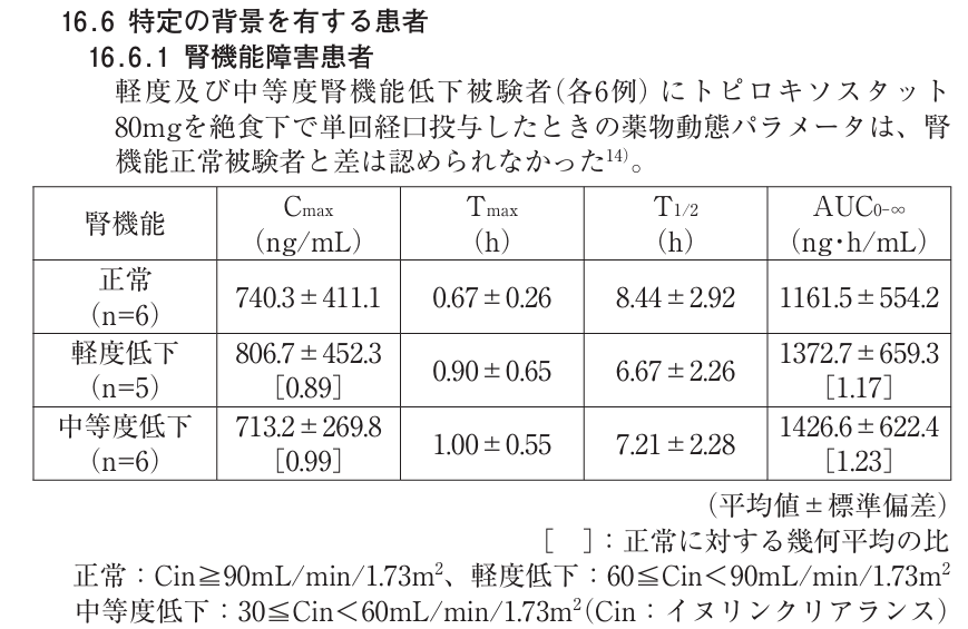 一方トピロキスタットでは軽度、中等度腎機能障害では腎機能正常の場合と比較して有意な差は認められません。