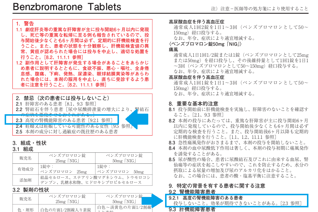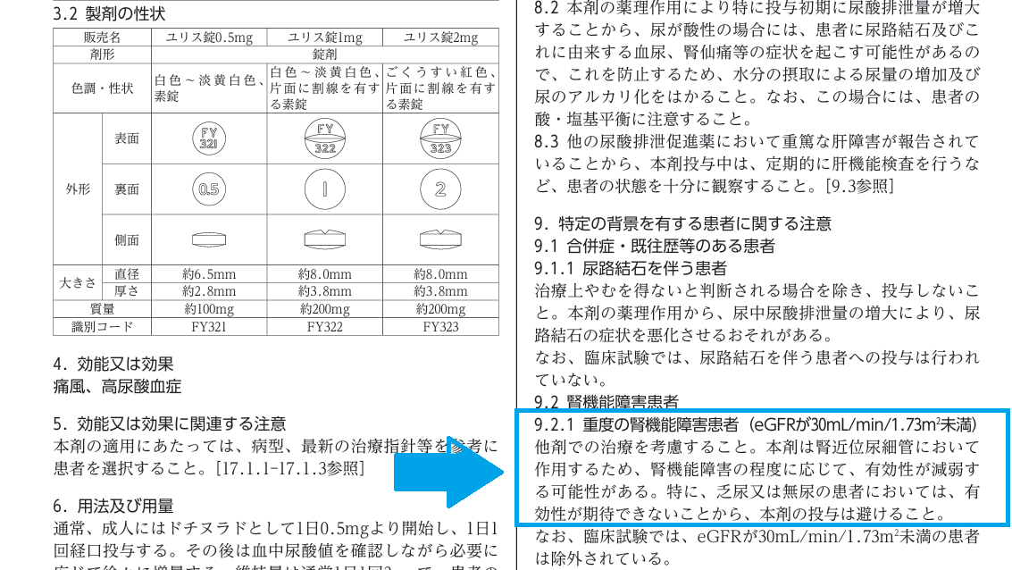 尿酸排泄促進薬は近位尿細管での尿酸の再吸収を阻害することで、尿酸低下効果を発揮します。重度腎機能障害では尿を生成する能力自体が低下しているので、効果が期待できません。そのため重度腎機能障害患者には用いません。