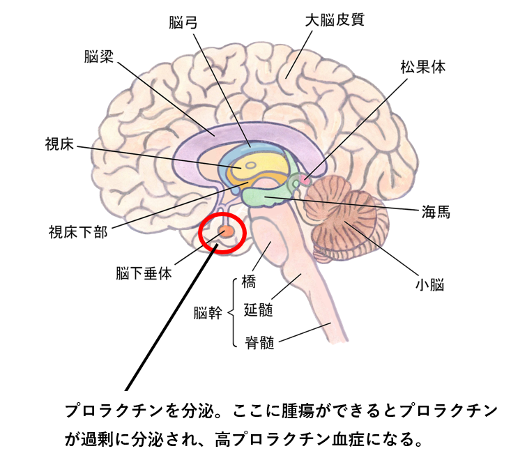 プロラクチノーマとは脳下垂体の良性腫瘍でプロラクチンが過剰に分泌されてしまう疾患です。プロラクチンとは乳腺に作用するホルモンであり乳汁の産生・分泌、乳腺の発育、性腺の機能抑制などの働きがあります。