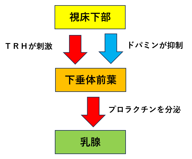 なおプロラクチンは視床下部より分泌されるドパミンによって分泌が抑制され、TRH(甲状腺刺激ホルモン放出ホルモン)によって分泌が促進されます。