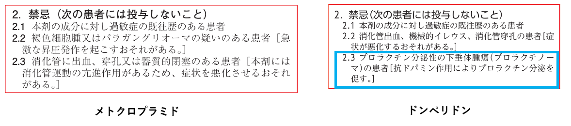 このことからメトクロプラミドはプロラクチノーマに禁忌でないのに対して、ドンペリドンは禁忌な理由が説明できると思います。