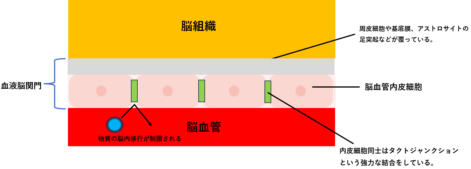 薬に限らず栄養素、酸素など様々な物資は脳血管から脳組織に移行します。しかし脳血管内皮細胞は細胞同士がタイトジャンクションという強力な接着をしており、物質の移行が制限されています。さらに内皮細胞の外側は周皮細胞(ペリサイト)や基底膜、アストロサイトの足突起で覆われています。これを血液脳関門といいます。血液脳関門は脳のバリアとして働き、これにより有害な物質が脳内に移行するのを防いでいます。