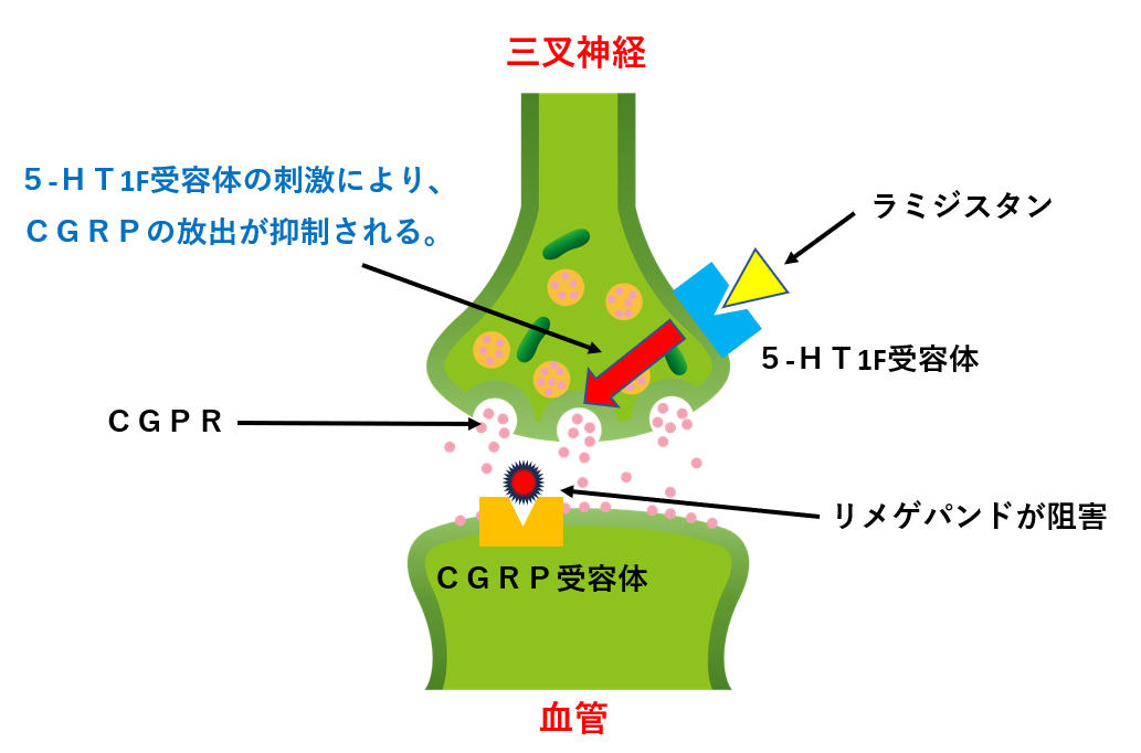 リメゲパントもラミジスタンもCGPRの働きを阻害することで片頭痛に対して効果を発揮します。