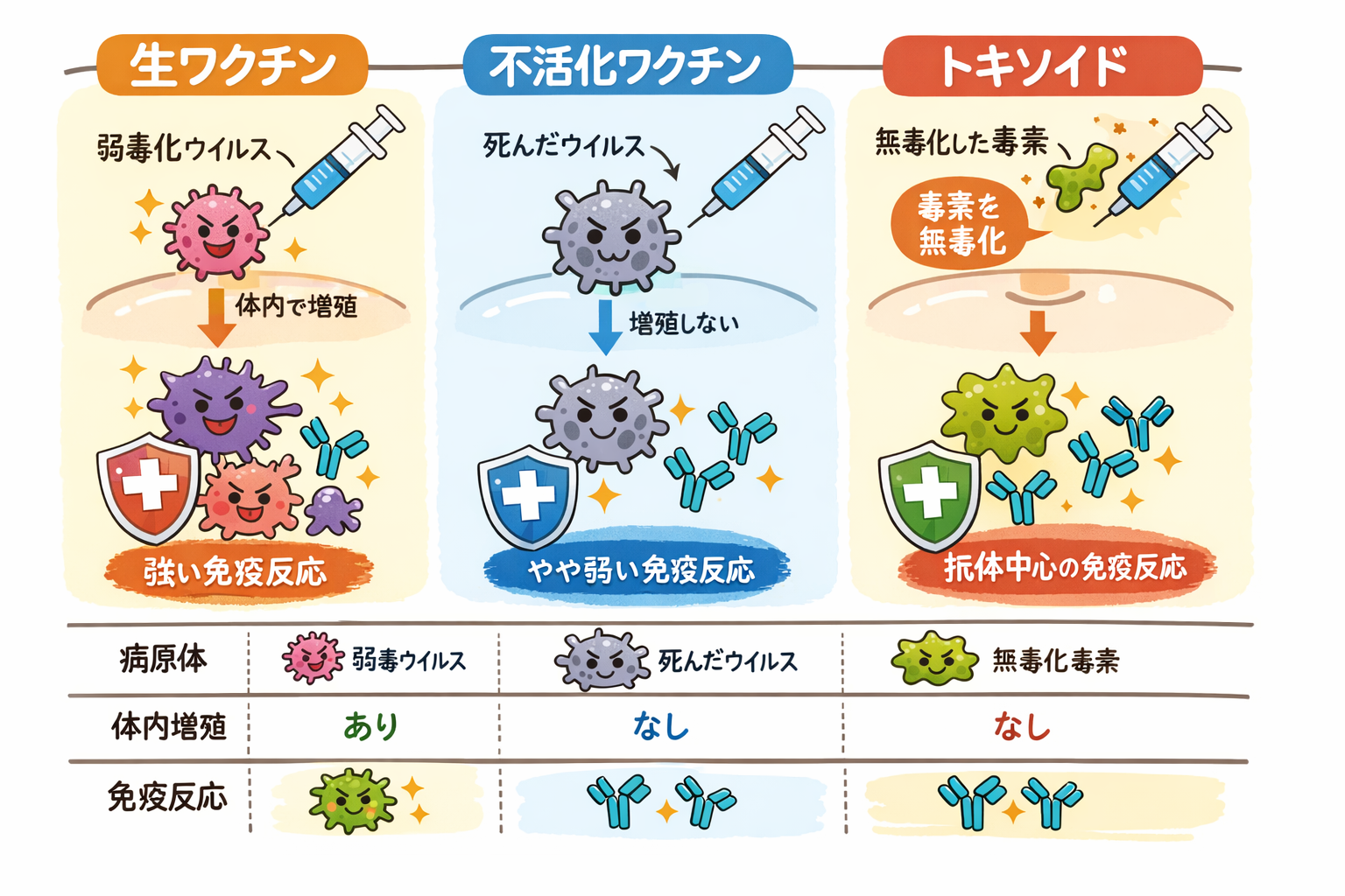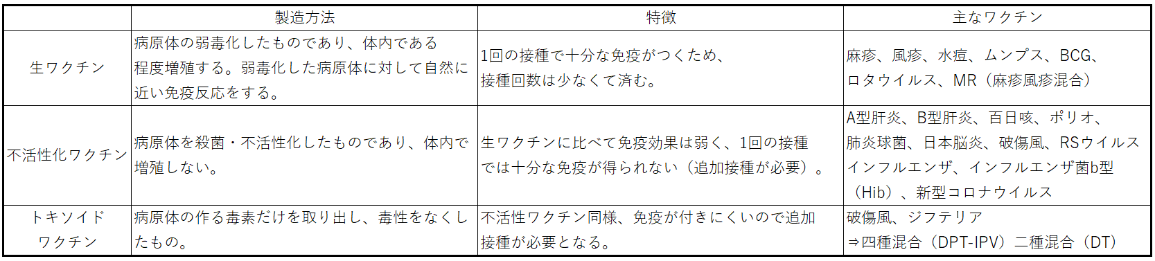ワクチンには生ワクチン、不活性化ワクチン、トキソイドワクチンがあります。