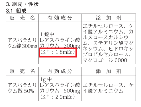 アスパラカリウム®錠(300)には1錠あたりカリウムが1.8mEq含まれていることが記載されています。