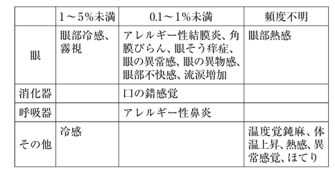 TRPV1は前述したように熱や痛みに対する受容体です。これを阻害してしまうので体温が上昇したり、痛みを感じにくくなってしまうのは容易に想像できます。アバレプト®懸濁性点眼液は点眼といった局所投与なので全身症状はありませんが、患部の冷感や異常感といった症状はおきてしまうようですね。