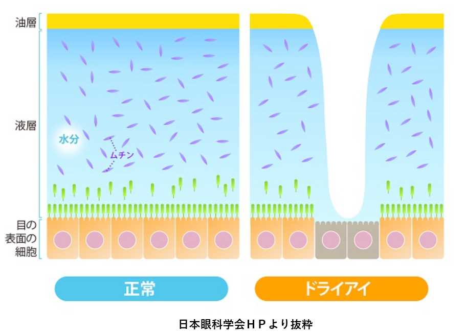 涙液の減少により水層が足りなくなったり、涙液の成分異常で油層が少なくなると水層の水分がすぐに蒸発してしまい、眼表面が露出してしまい外部刺激が角結膜上皮細胞に直接届いてしまいます。