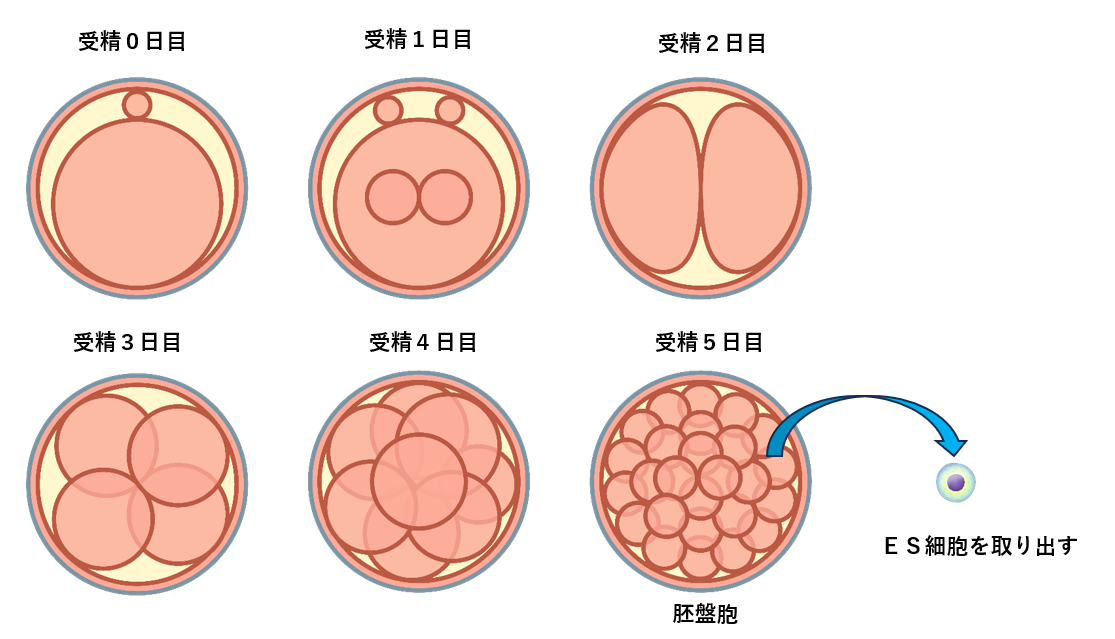 ※胚とは受精卵が分裂を始めてから胎児の形が整うまでの段階をさします。ES細胞は受精から5日目くらいの胚(胚盤胞)から取り出されます。