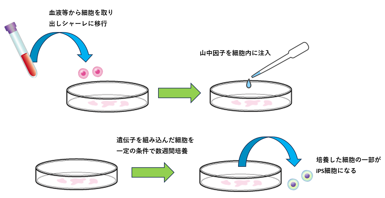 iPS細胞の作り方は患者の皮膚や血液から細胞を採取し、これをシャーレに入れます。そこに山中因子と呼ばれる初期化因子を投入します(山中因子はOct3/4, Sox2, Klf4, c-Mycの4つの遺伝子です)。