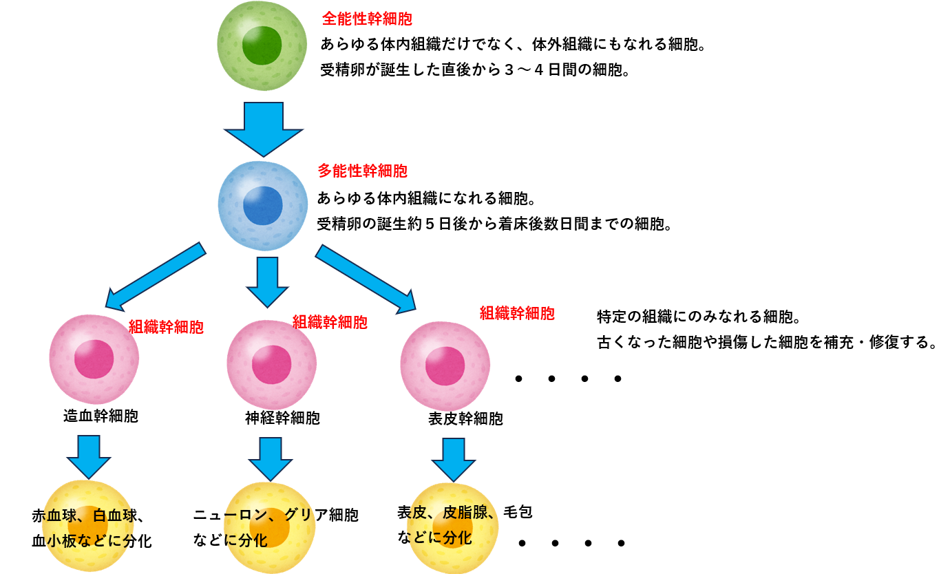 しかし出生時には多能性幹細胞は組織幹細胞に分化しており多能性は失われています。組織幹細胞は皮膚や血液、神経など特定の組織にのみ分化する能力を持った細胞です。