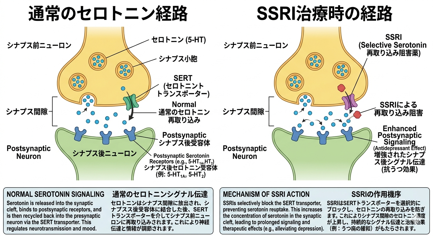 SSRIはシナプスでセロトニンのシナプス前膜への再取り込みを阻害します。これによりシナプス間隙でのセロトニン濃度が上昇し、シナプス後膜のセロトニン受容体への働きが増強します。