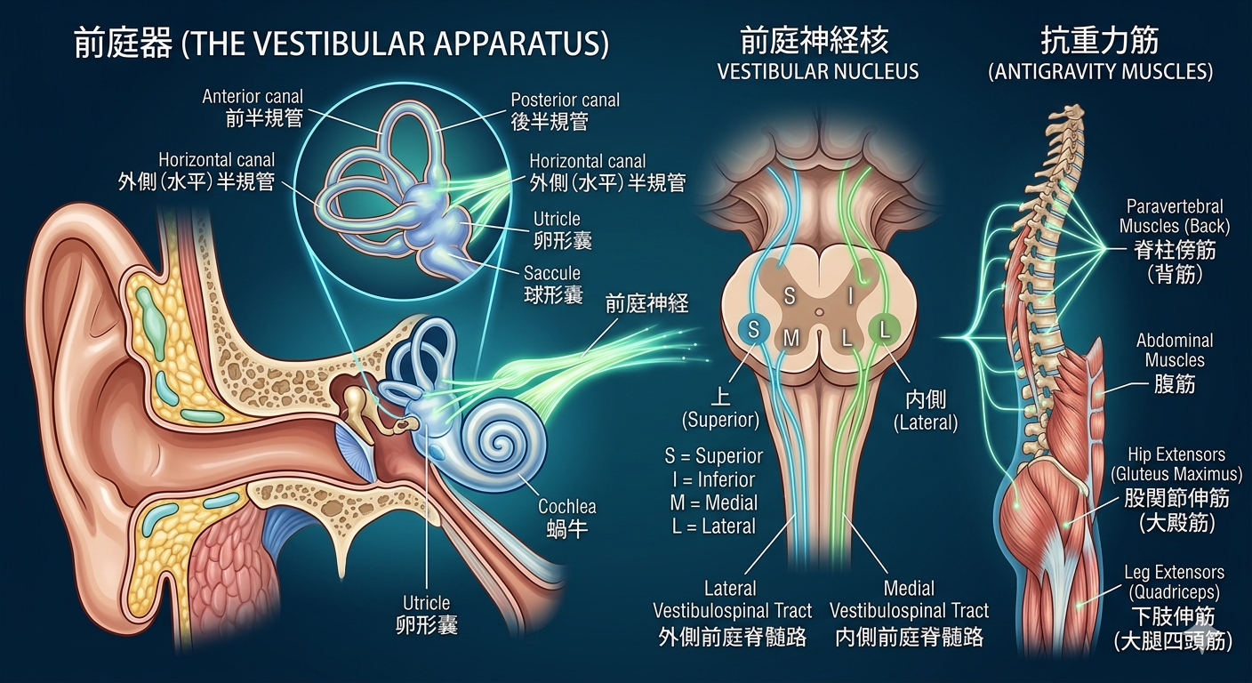 前庭神経核ではこれらの情報を元に自身が正しく立てているかを判断し、眼球や脊髄の抗重力筋 へと伝達し、眼のピントや体中の筋肉を調節しバランスを保っています。