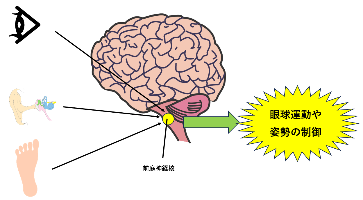 内耳には三半規管の有毛細胞や耳石器といったセンサーが存在し、体の平衡感覚情報を前庭神経を通して、脳幹の前庭神経核に伝えられます。前庭神経核には内耳からの情報だけでなく、視覚情報や足裏などの感覚情報も伝えられます。