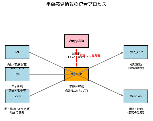 内耳からの平衡感覚情報は前庭神経核を通って脊髄の抗重力筋に伝えられます。前庭神経核は扁桃体とつながっており、扁桃体が興奮すると前庭神経核の感度が上昇します。その結果、無視してよい程度のわずかな情報でも「めまい」として過敏に反応するようになります。